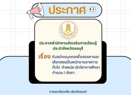 ประกาศสำนักงานส่งเสริมการเรียนรู้ประจำจังหวัดชลบุรี เรื่อง รับสมัครบุคคลเพื่อสรรหาและเลือกสรรเป็นพนักงานราชการทั่วไป ตำแหน่ง นักวิชาการศึกษา จำนวน 1 อัตร